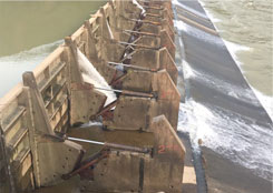 翻板壩阻水,經(jīng)不住洪水的沖擊,易被漂浮物卡塞或上游淤積造成不能自動翻板,容易被洪水沖壞壩體影響防洪安全。洪水過后翻板門再關上時被異物卡住,造成大量漏水,一旦淤積厚度較大或泥沙板結,閘門就不能正常回門(眾多閘門中只要有一扇),將影響河道正常蓄水。汛期漂浮物(特別是樹枝)經(jīng)??ㄗ¢l門導致起翻或回落困難,威脅到行洪安全。